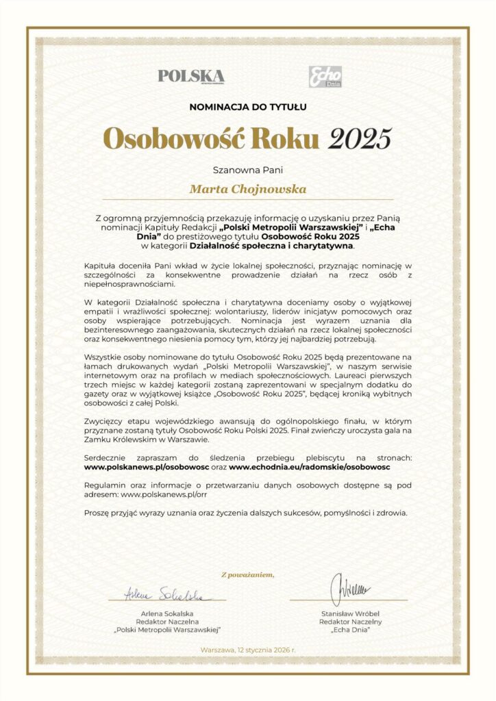 Drodzy Przyjaciele Z dumą i radością dzielimy się z Wami informacją, że nasza Pani Prezes Marta Chojnowska decyzją Kapituły Redakcji ‘’Polski Metropolii Warszawskiej‘’ i „Echa Dnia” została ponownie nominowana do prestiżowego tytułu Osobowość Roku 2025 Płock w kategorii Działalność społeczna i charytatywna.